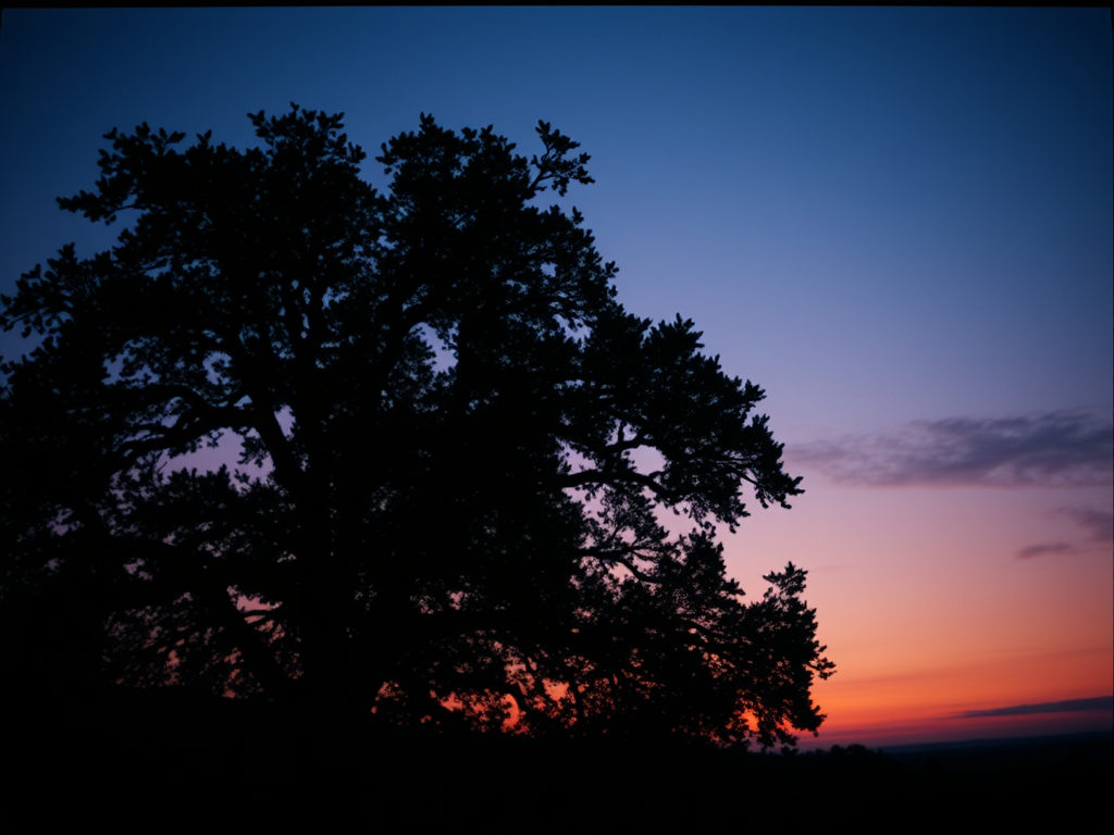 I pull the blankets to my chin, gazing out the bedroom window. My favorite tree, a fifty-foot oak, is illuminated by moonlight. During its growing years, the tree branched out, splitting in two directions. One branch grew eastward, the other westward. After travelling in opposite directions for twenty feet, the branches decided to reunite. The silhouette of the tree now forms a heart upon which I gaze every night before falling asleep.